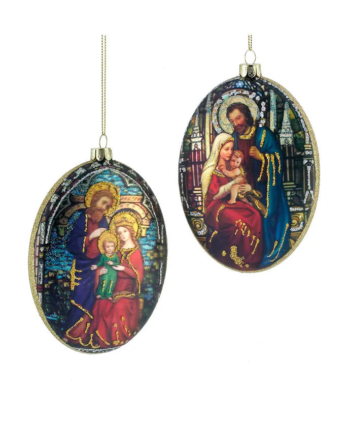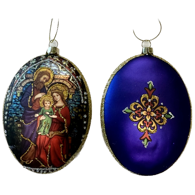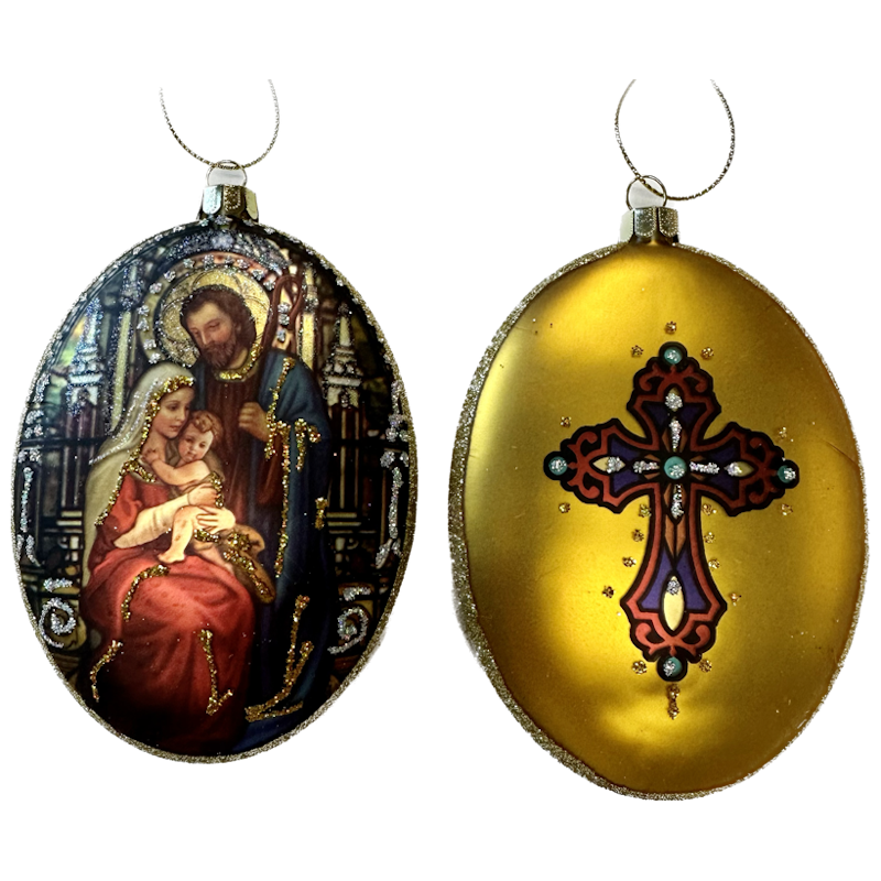 This oval glass ornament is a beautiful addition to your holiday decor. Made of high-quality glass, it features a gorgeous depiction of the Holy Family. Perfect for displaying on your tree or as a unique gift for a loved one, it adds a touch of elegance and meaning to any Christmas celebration.