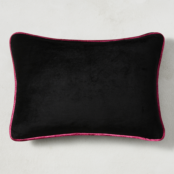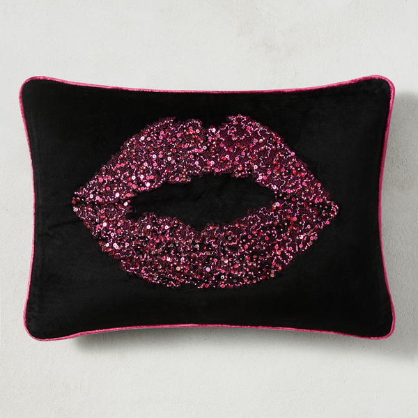 - Silky-soft black velvet base pillow with fuschia piping border sets the perfect background for a pop of colorful contrasting sequined lips.