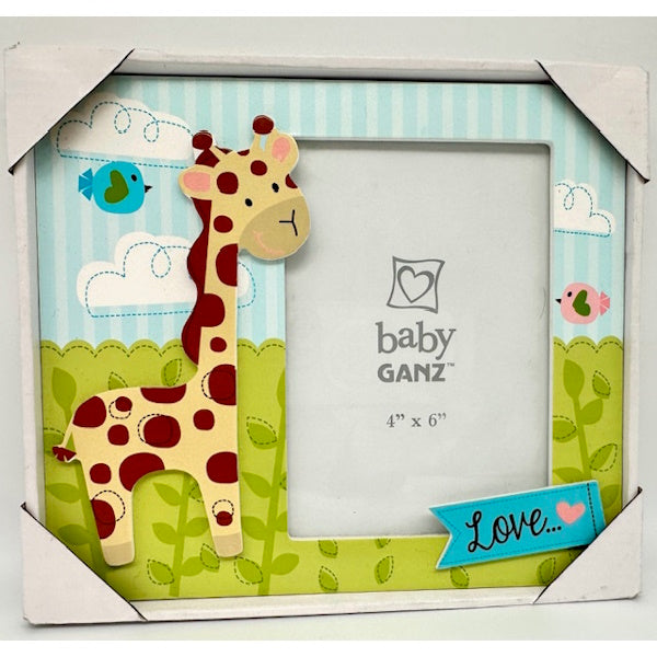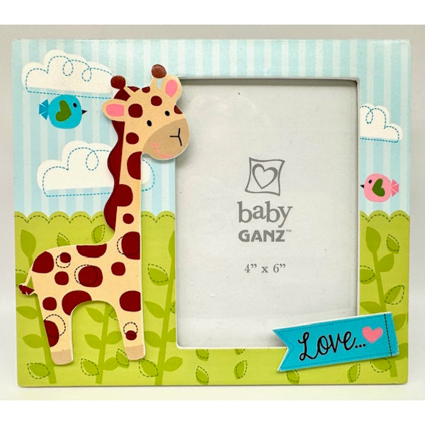 - Painted multicolored wood picture frame with layered wood cut-outs of Jamie Giraffe and 'Love' pennant flag. Holds 4" x 6" vertical photo, easel stand on back