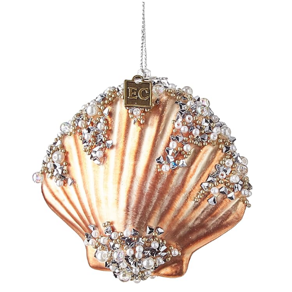 - An Eric Cortina Collectible glass ornament, this coral-colored sea scallop ornament is loaded with varying sizes of high quality beads and pearls. Sure to be a coastal treasure on your tree for many years to come!