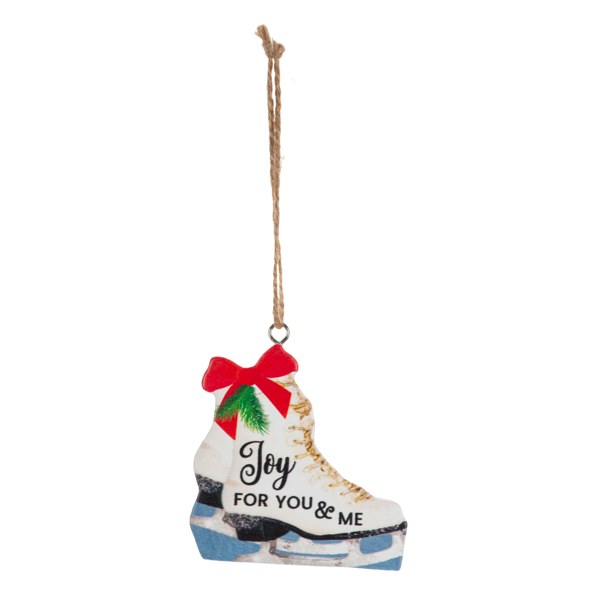 Add a playful touch to your holiday decorations with this painted wood ornament shaped like ice skates. Bright and cheerful, it features the fun sentiment "Joy for you & me," perfect for spreading smiles and festive vibes all season long.