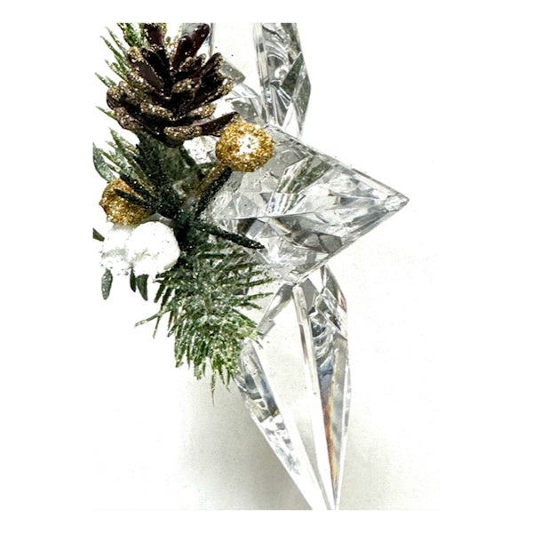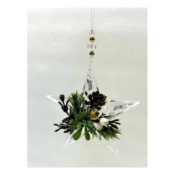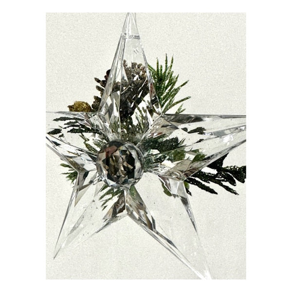 - Clear acrylic star with green and gold mistletoe and pine greenery on front, large clear rhinestone on back with clear and gold beads on clear hangar