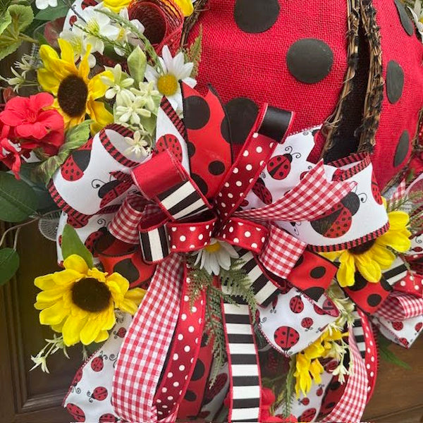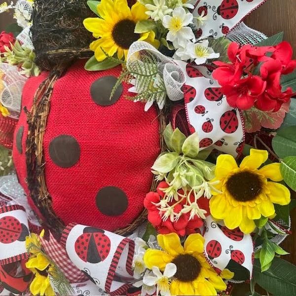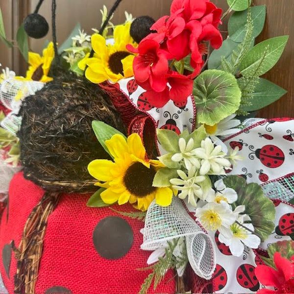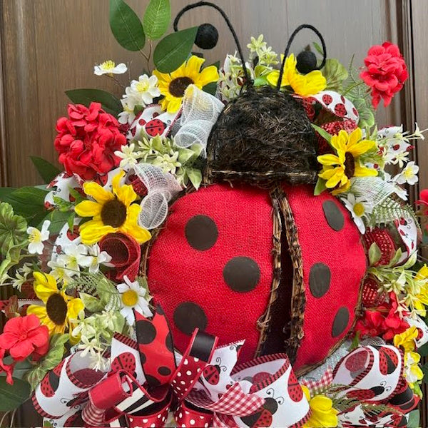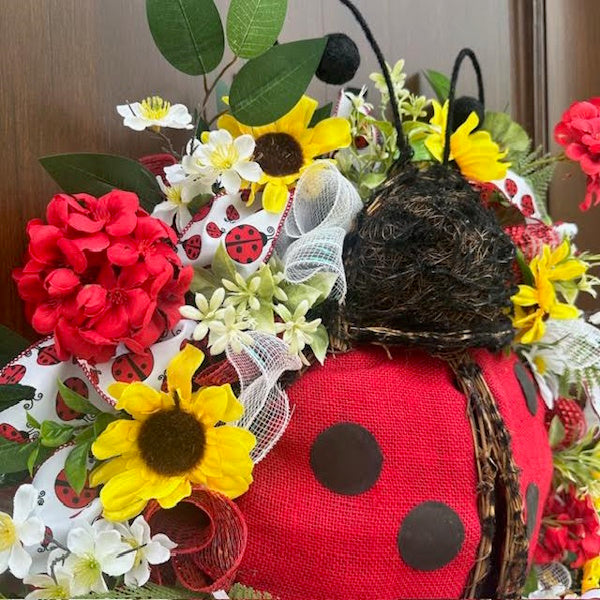 - This bold little Ladybug is bursting with joy to say Hello! Let her greet your guests this summer with style! This handmade Ladybug Wreath is stuffed full of cheery florals and two juicy bows you will love.