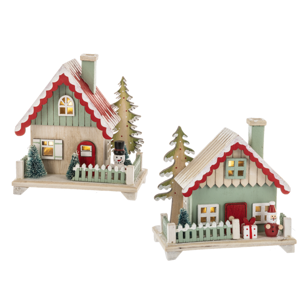 - 2 styles of mini Ski Chalets, each sold separately: Red roof with snowman, or white roof and Santa