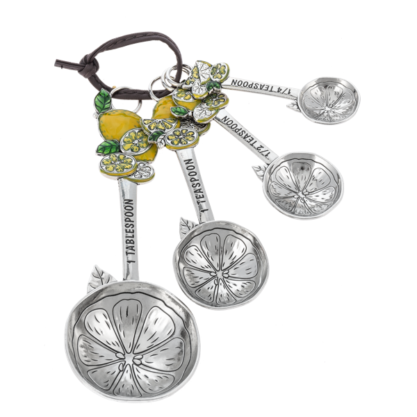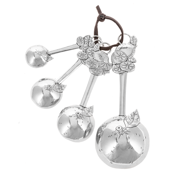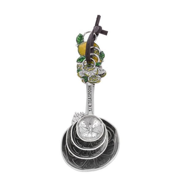 - Includes 1 ea. of 1 tbsp., 1 tsp., 1/2 tsp., 1/4 tsp. Colorful enamel design on front, plain silver and different design on back side, knotted together with a faux leather tie