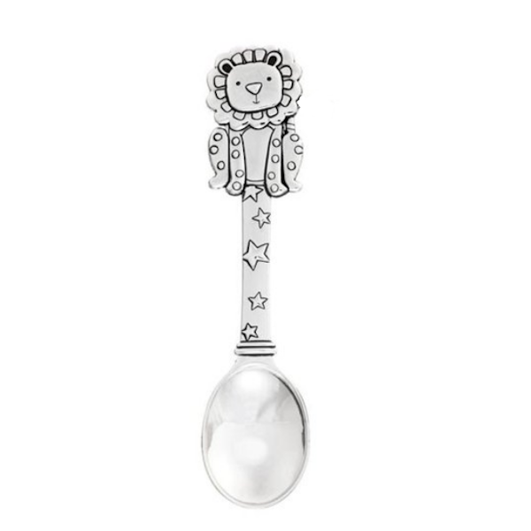 - Your little one will be the king of the table with this adorable silver-colored Lion Baby Spoon. Perfect size for baby and toddlers learning to eat new foods. Makes a cute shower gift.