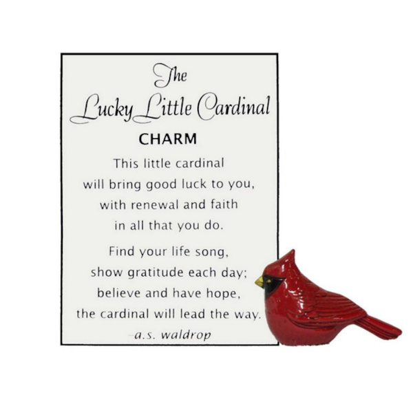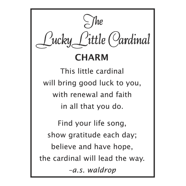 - This red Lucky Little Cardinal Charm comes with a card that reads "This little cardinal will bring good luck to you, with renewal and faith in all that you do. Find your life song, show gratitude each day; believe and have hope, the cardinal will lead the way. -A.S. Waldrop".