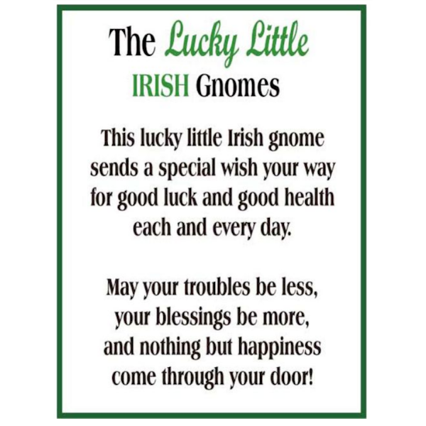 - The Lucky Little Irish Gnome figurine/charm comes with a card that says "This lucky little Irish gnome sends a special wish your way for good luck and good health each and every day. May your troubles be less, your blessings be more, and nothing but happines come through your door!".