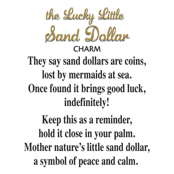 - Silver color sand dollar charm comes with a card that reads "They say sand dollars are coins, lost by mermaids at sea. Once found it brings good luck, indefinitley! Keep this as a reminder, hold is close in your palm. Mother nature's little sand dollar a symbol of peace and calm."