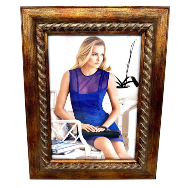 - Antique gold/brown finish, lightly carved picture frame, holds 5" x 7" photo. Easel backing, and hooks for wall mounting, can be used both horizontally and vertically