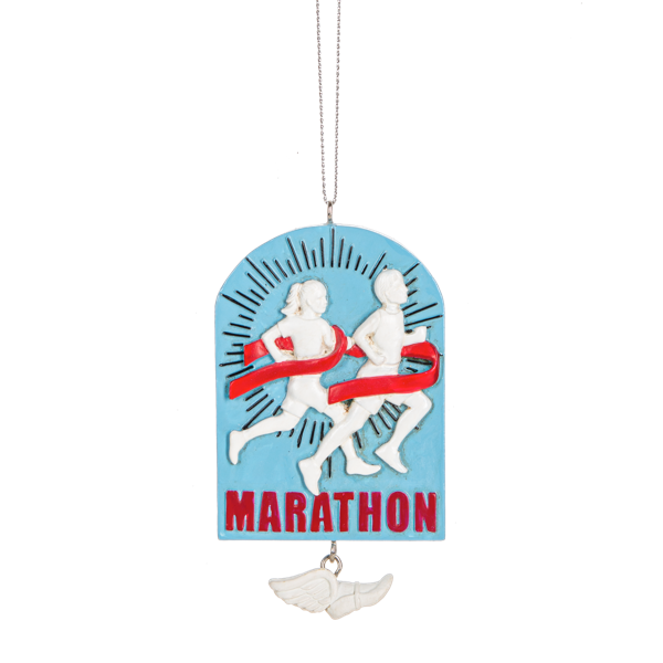 Celebrate the spirit of endurance with this Marathon Runner ornament featuring a winged shoe of Hermes dangling below. Its vibrant sky-blue base accented with red, white, and black details makes it a striking tribute to every runner’s journey. Perfect for inspiring motivation and honoring dedication, this ornament adds a meaningful touch to your holiday décor or gift collection.