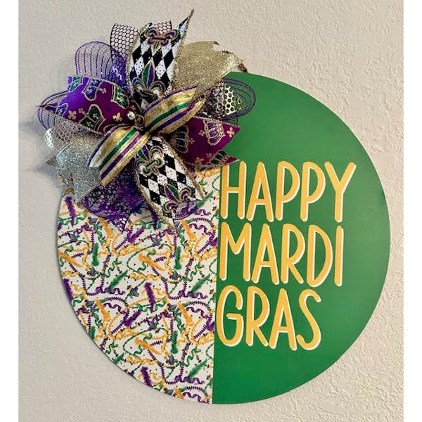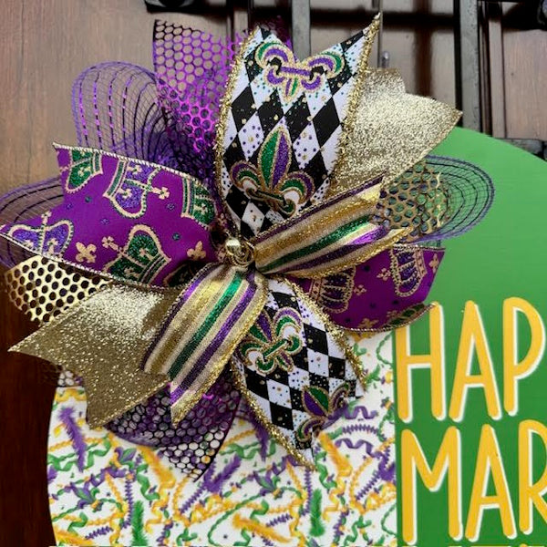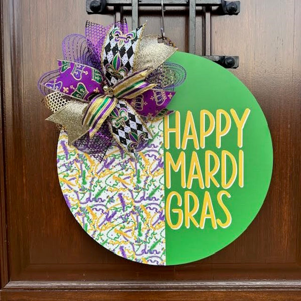 - Green, Gold, Purple and White coated wood sign UV printed with "Happy Mardi Gras" and a 10" bow