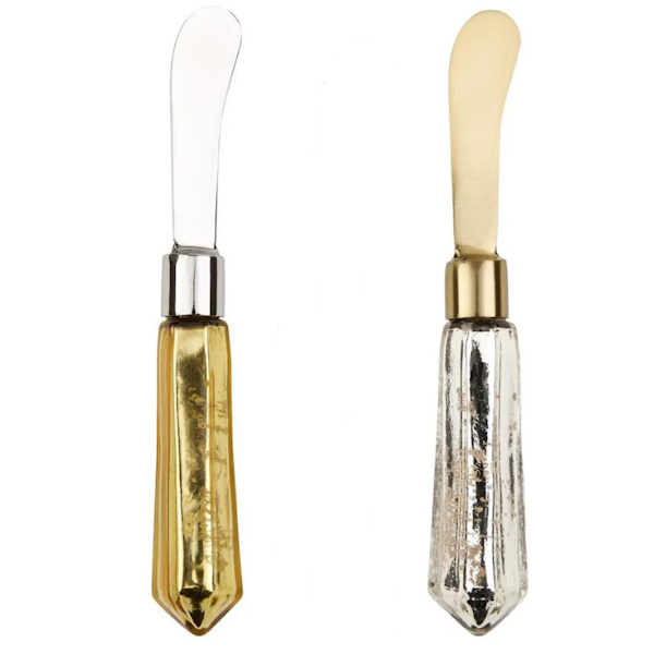 • An elegant addition for your cheeses, dips and spreads. Choose from metallic gold mercury glass handle with silver stainless steel spreader blade, or metallic silver mercury glass handle with gold stainless steel spreader blade. Each sold seperately