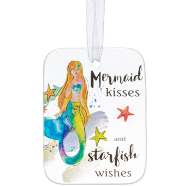 - Stylized mermaid art with 'Mermaid kisses and starfish wishes' adorn this glass ornament.
