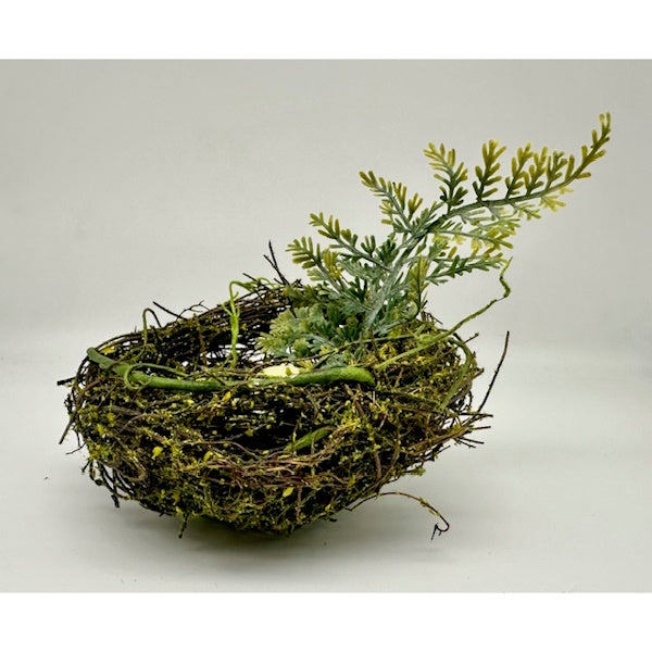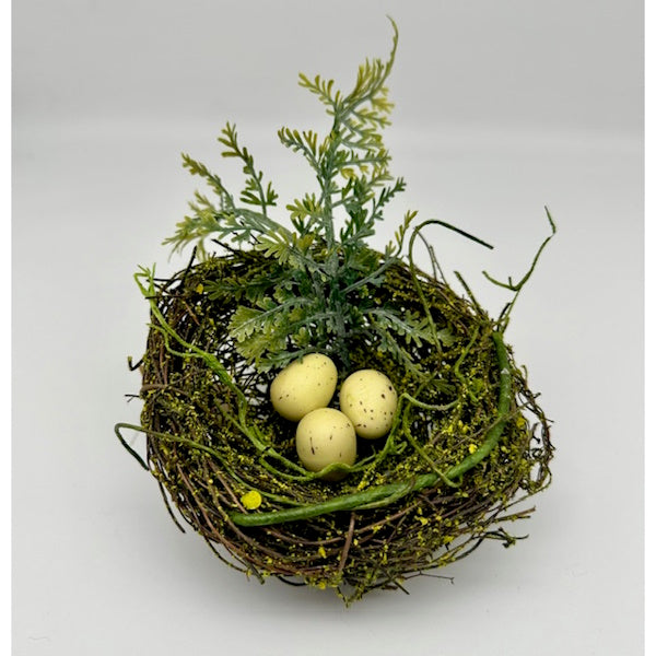 - Faux decorative bird's nest, enhanced with a sprig of fern and three 1" golden eggs inside! Darling for a wreath, planter or centerpiece!