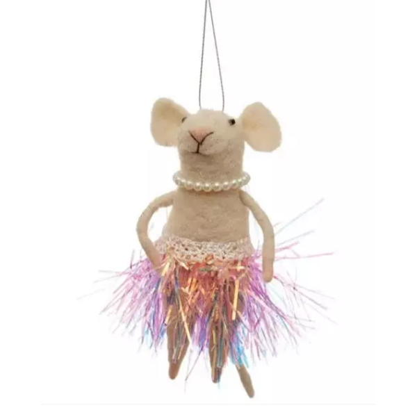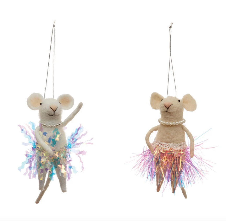 - These ornaments are an adorable addition to any home during the Christmas season. Made out of wool felt, these cute mice ornaments come in 2 styles with irridescent tinsel skirts and beaded necklaces. These look great on any tree, and make decorating with friends and family fun