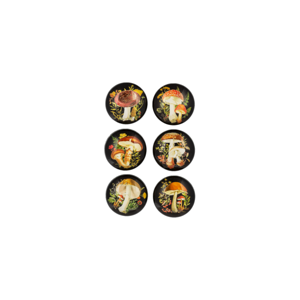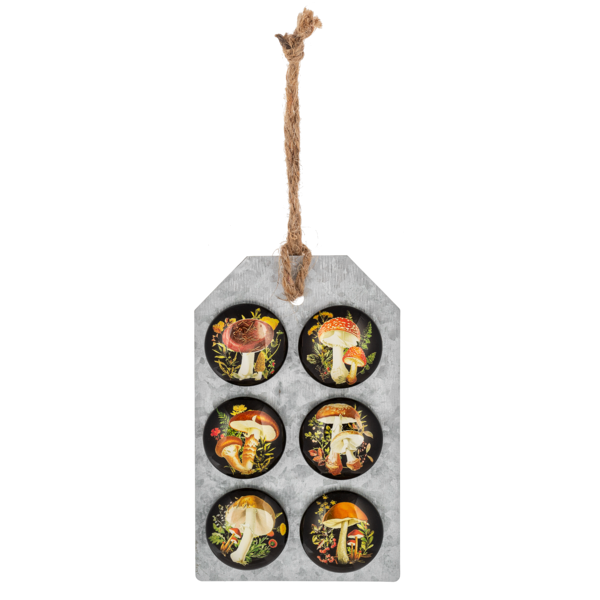 - Set of 6 round glass magnets, each themed magnet is approximately 1 3/8" diameter and comes wrapped in cellophane on the galvanized aluminum board shown