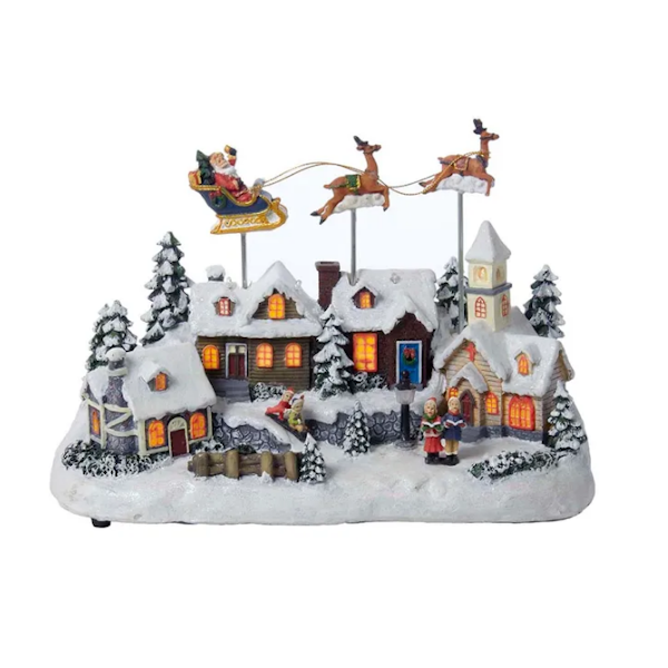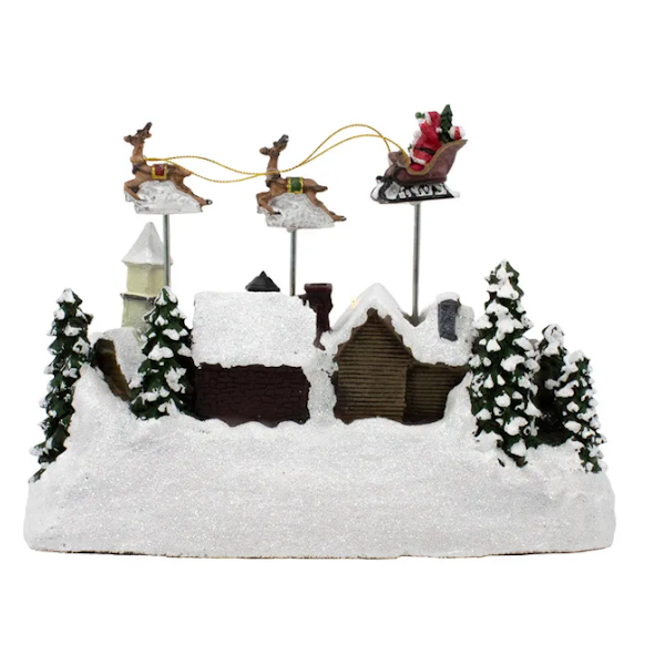 - Watch Santa fly over a village with this Kurt Adler musical table piece. This piece features a peaceful row of houses that illuminate from within. In front of the houses there are two carolers and two children playing in the bright white snow. Above this idyllic scene is Santa in his sleigh being pulled by his eight reindeer. When activated, the houses light up, one of eight beloved holiday classics begins to play and Santa's sleigh moves up and down!