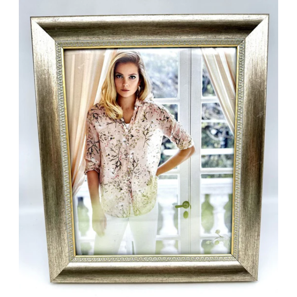 - Champagne gold frame, holds 8" x 10" photo. Easel backing with hooks for wall mounting, both horizontal or vertical