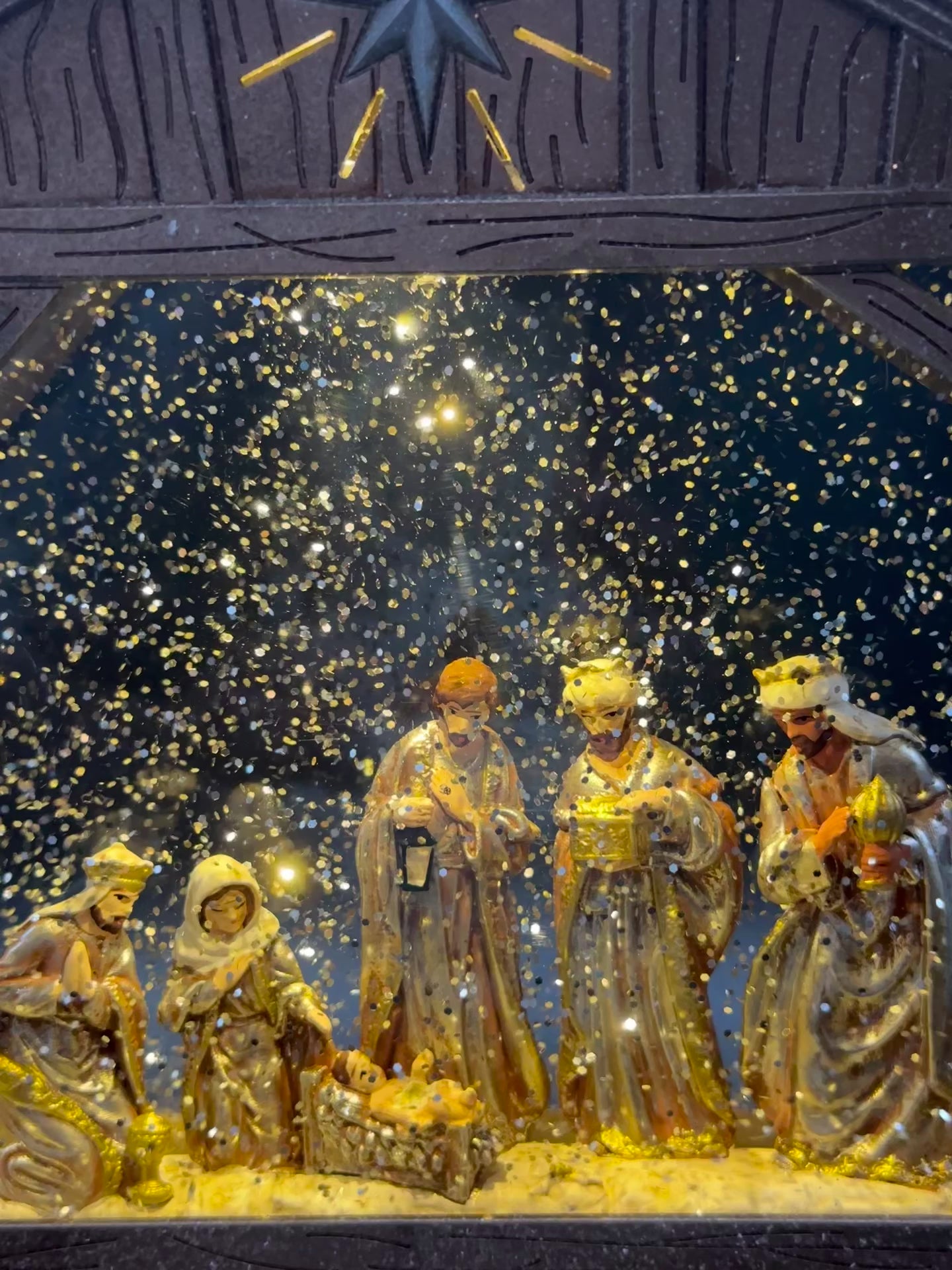 - Glittered gold casing, silver and gold Nativity scene with swirling silver glitter