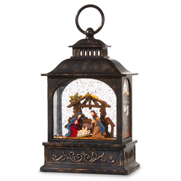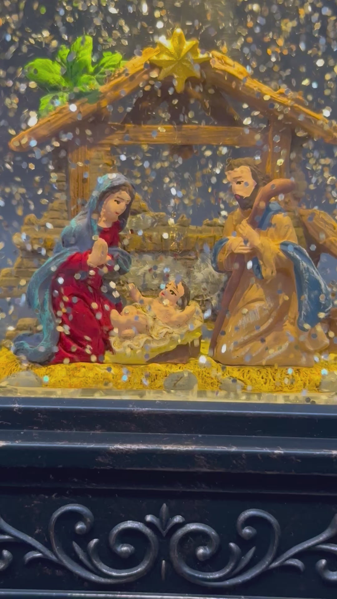 - Antiqued black/bronze casing, multicolored Nativity scene with silver glitter