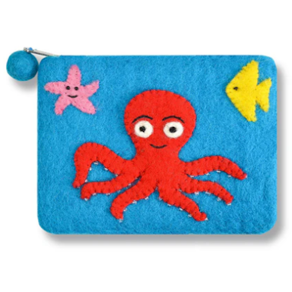 Handcrafted in Nepal-Aqua blue coin purse with red octopus/seed bead tentacle accents, yellow fish and pink starfish friends