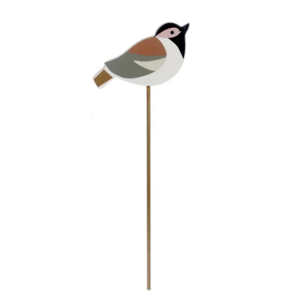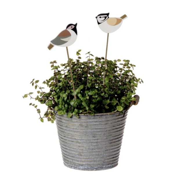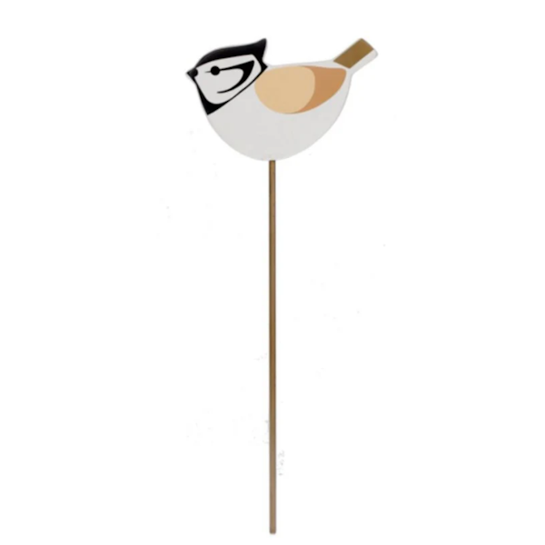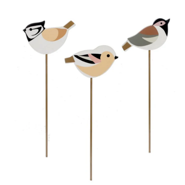 - Painted bird wood plant stakes, neutral tones with black accents.