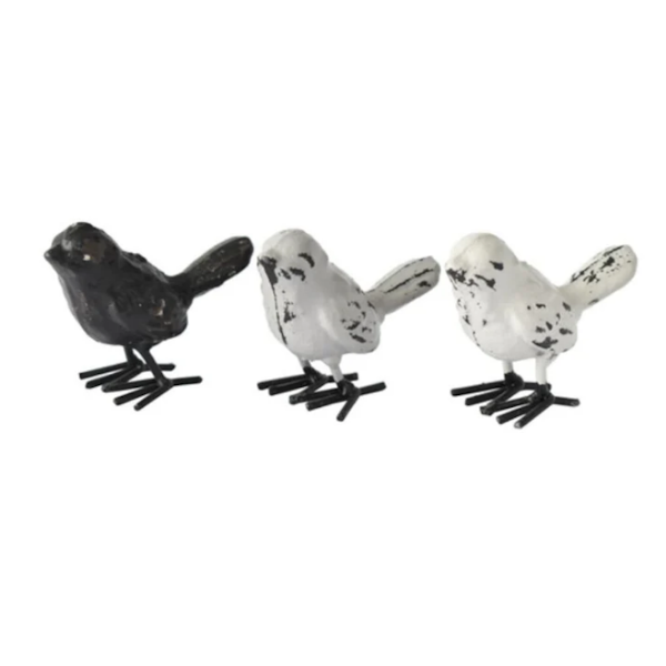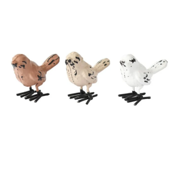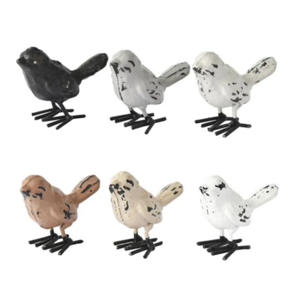 - Distress painted mini birds in a variety of neutral tones-black, dark grey, light grey, rust, gold and white. Each sold separately.