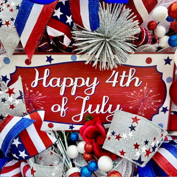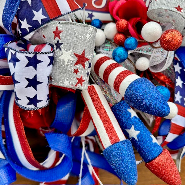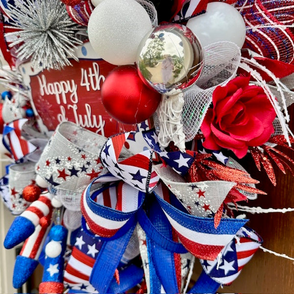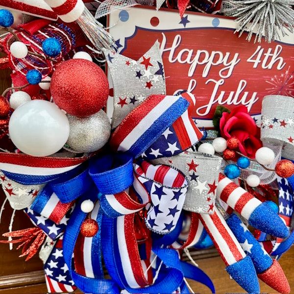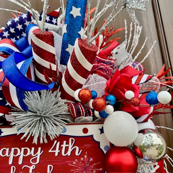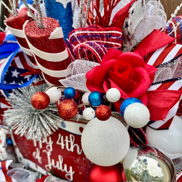 Celebrate Independence Day with this lively Patriotic Wreath featuring a cheerful "Happy 4th of July" sign. Bursting with rockets, firecrackers, and vibrant red, white, and blue ribbons and bows, it’s accented by bright red roses for a festive touch. Handmade with energy and spirit, this wreath brings joyful patriotism to your doorstep, perfect for welcoming guests and sparking holiday cheer.