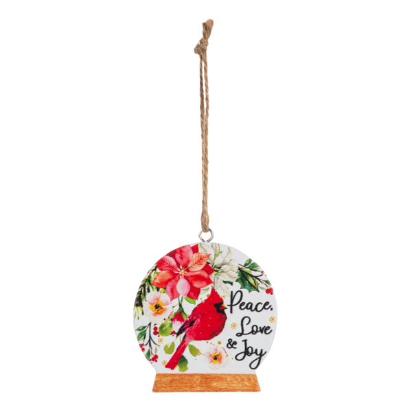 - Chunky painted wood ornament cut in the shape of a snowglobe. A beautiful red cardinal and holiday poinsettia on the ornament front, with 'Peace, Love & Joy" written to the side.