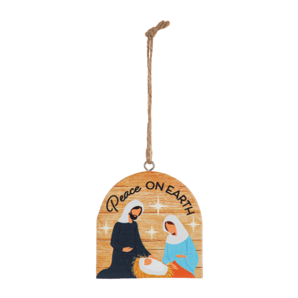 - Chunky painted wood ornament of Nativity scene with "Peace On Earth" above the lovely details. Also makes a great ornament to personalize!