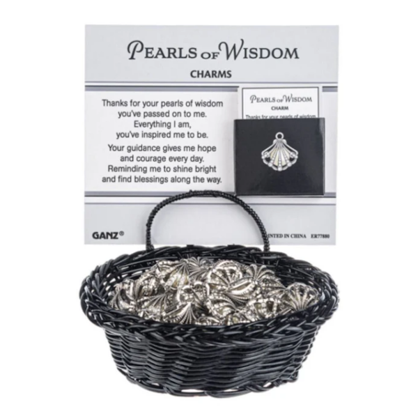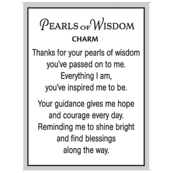 - The silver Pearls of Wisdom Charm comes with a card that reads "Thanks for your pearls of wisdom you've passed on to me. Everything I am you've inspired me to be. Your guidance gives me hope and courage every day. Reminding me to shine bright and find blessings along the way." Inside, you can see a pearl clasped between the 2 halves of the shell, and the front half of the shell is decorated with rhinestones. You can add a jump ring to this charm and attach it to a necklace or charm bracelet.