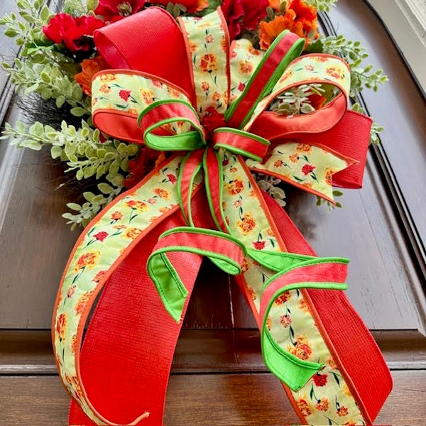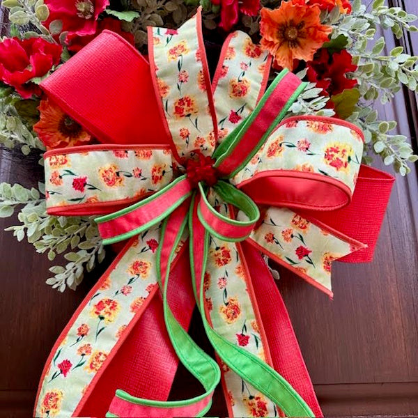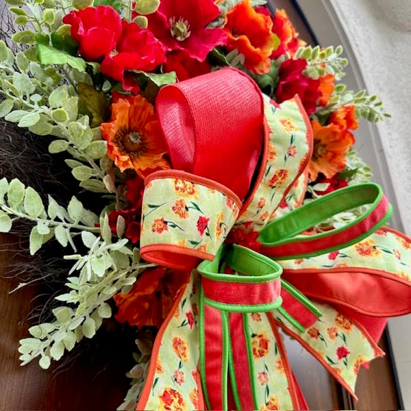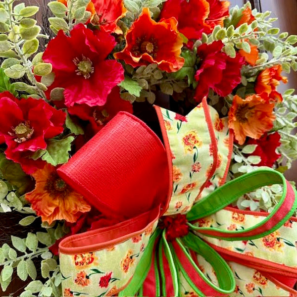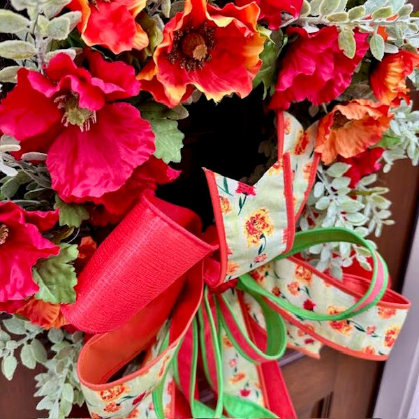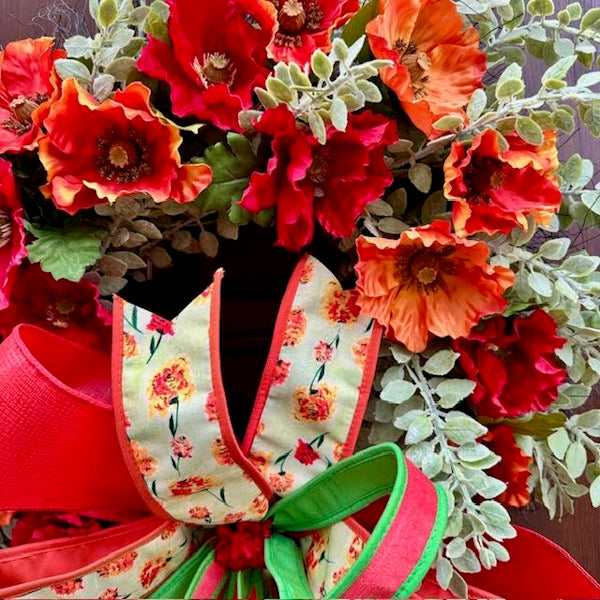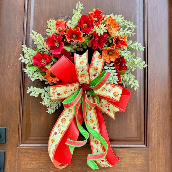 Elevate your entryway with our bespoke Poppy Eucalyptus Wreath, featuring vibrant red and orange poppies artfully arranged on a lush eucalyptus base. The crowning touch is an oversized handcrafted bow created with premium John Mark designer ribbons. Each wreath is meticulously customized to bring a refined botanical statement to your home décor.