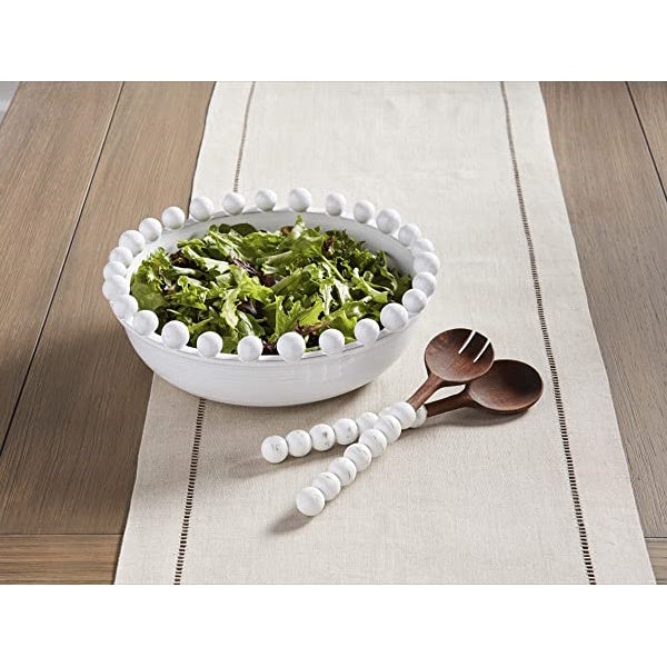 - Glazed Terracotta bowl features oversized beaded rim. Includes beaded wood serving utensils.