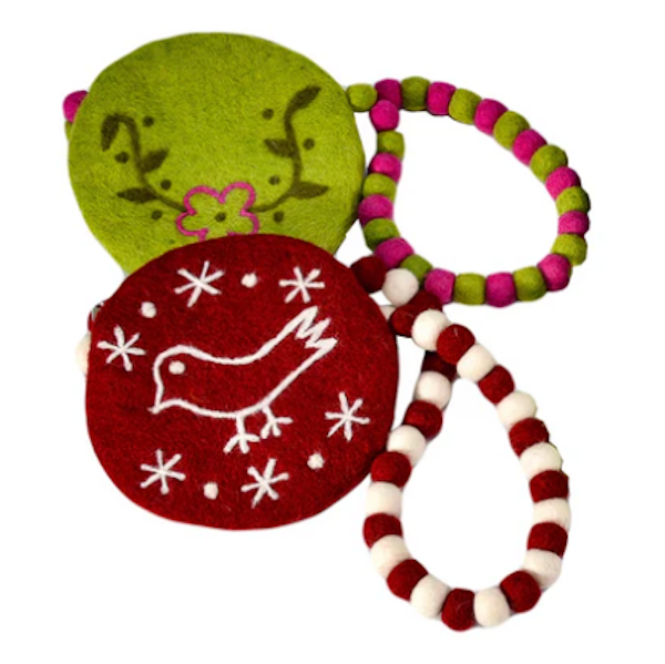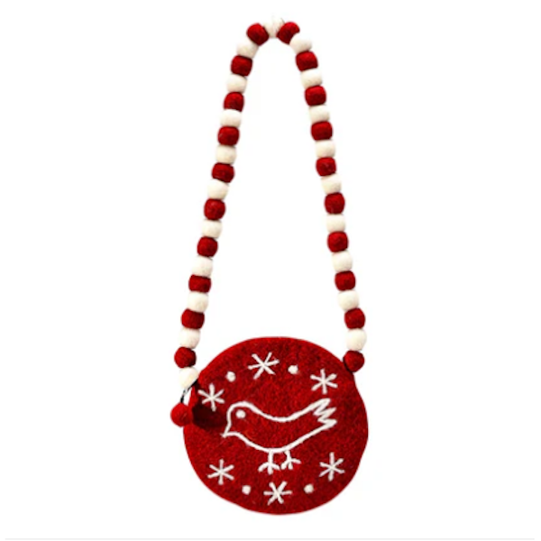 - Our Felted Red Bird Ball Handle Kids Bag, lined with durable nylon inside and a zipper closure, it's a classic accessory for any young lady. Handcrafted in Nepal using 100% wool, it's a perfect gift for children. Functional and unique, this bag is wonderful for carrying small essentials while adding a touch of whimsy to any outfit.