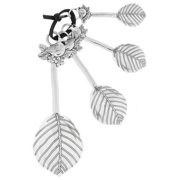 - Includes 1 ea. of 1 tbsp., 1 tsp., 1/2 tsp., 1/4 tsp. Colorful enamel design on front, plain silver and different design on back side, knotted together with a faux leather tie