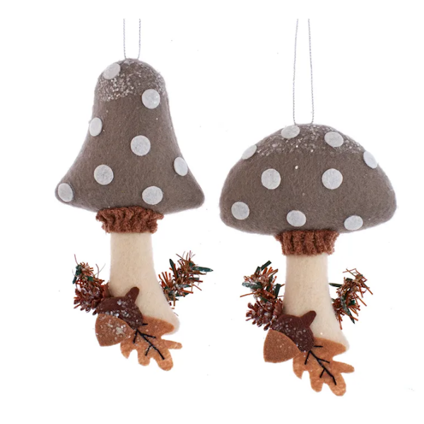 - These mushroom ornaments from Kurt Adler are a whimsical addition to any holiday décor or Christmas tree. This assortment features two felt mushroom ornaments, each decorated with iridescent glitter and white polka dots surrounded by felt, artificial pine sprigs, glittered acorns and leaves.