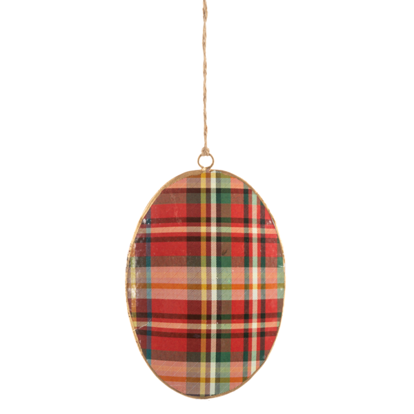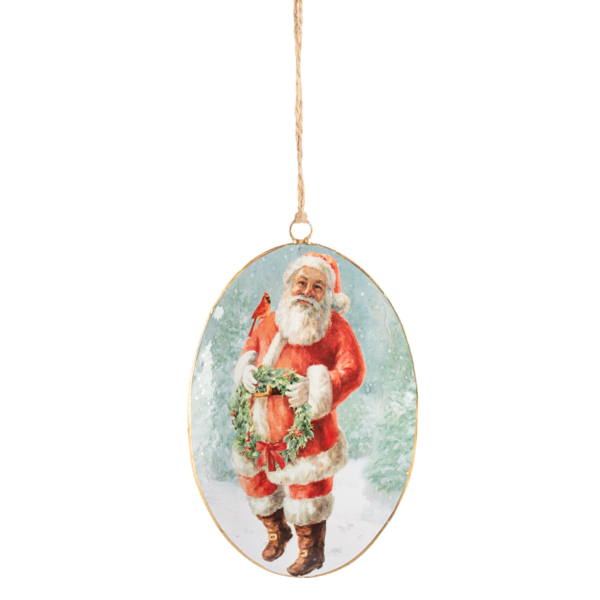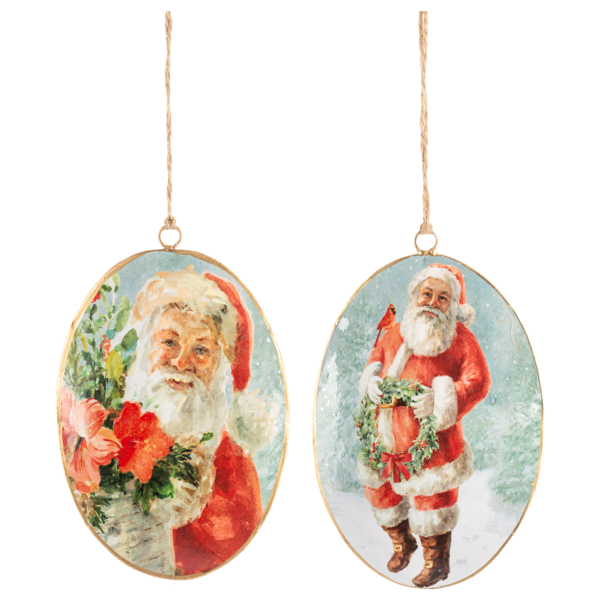 - Classic Santa metal disk ornament-2 options to choose from, a close-up view, or a standing Santa holding a wreath. Both have the lovely red Tartan plaid print on the back side.