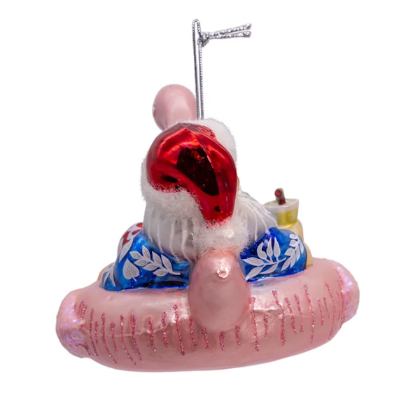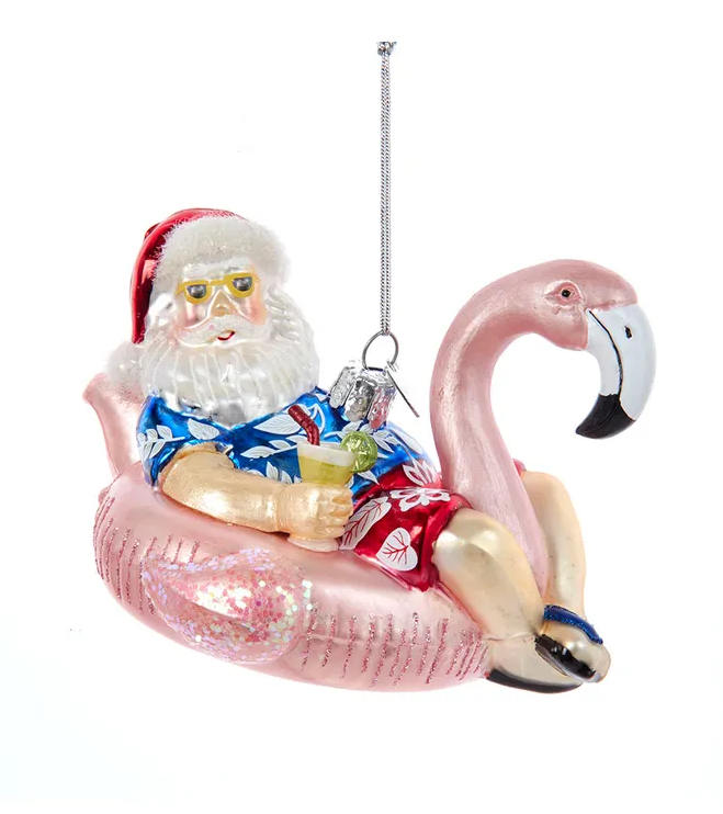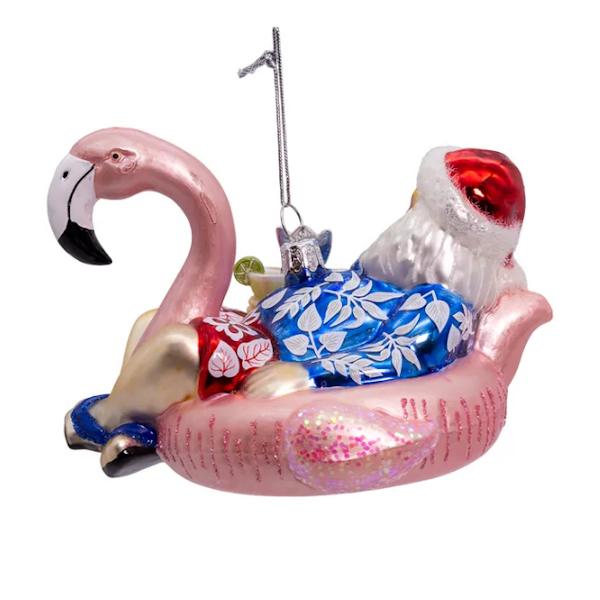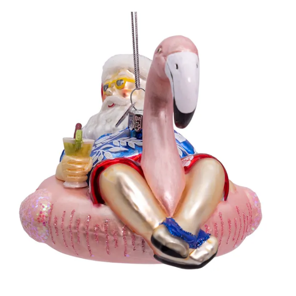 - Noble Gems™ is a collection of beautiful glass ornaments celebrating different occasions, meant to last year after year so that you could preserve and reflect upon your memories each holiday season. Each ornament is an intricate work of art that is sure to be treasured. This Noble Gems™ glass Santa in flaming float is a fun and festive addition to any holiday décor or Christmas tree. Santa is beach ready holding a tropical drink and sitting comfortably in a pink flamingo pool float ornament.