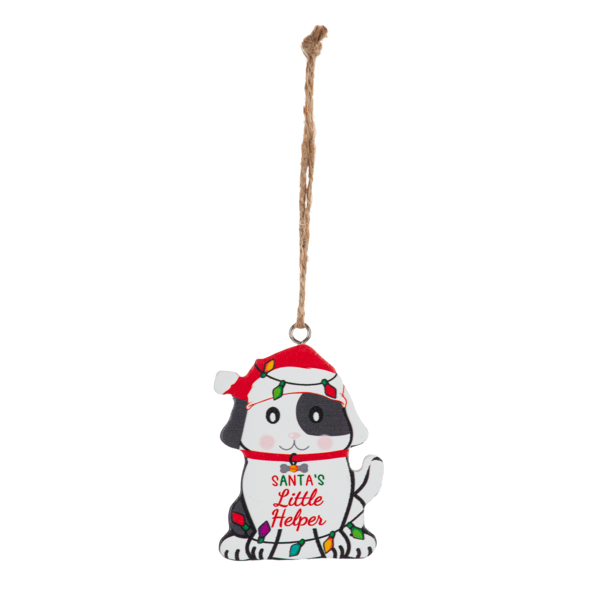 - Painted wood dog shaped ornament with "Santa's Little Helper" on the front. Cute gift for a dog lover!