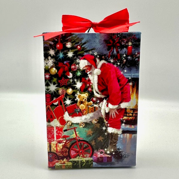 Santa's Toy Bag depicts a heartwarming Christmas scene of Santa delivering a bounty of toys on a magical night. White LED lights highlight the art to illuminate it and create a special sparkle! Red ribbon hanger at top enables this to be hung on a wall, or use the easel stand and it may rest on a tabletop vignette.