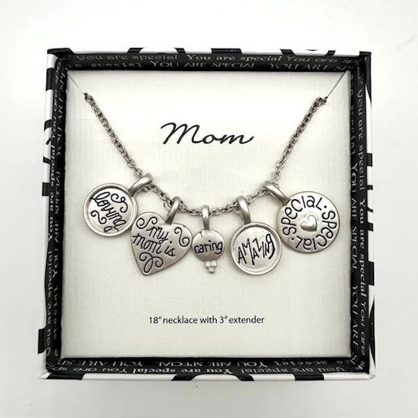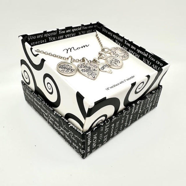 - Sentimental MOM Charm Necklace has 5 charms that read "my Mom is", "loving", "caring", "amazing" and "special". It comes in a decorative black and white gift box with the text "You are special" written to create a design on the box top and printed on the bottom with:"A few simple words can never express how special you are. You are such an important part of my patience and triumph, my giggles and whispers, my comfort and joy, my strength and inspiration. All that you are means everything to me." Your mom will cherish this sweet necklace!