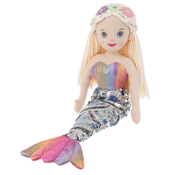 - This Shimmer Cove[TM] Mermaid Shelly is new to the Mermaid Cove! She has long blonde hair, with a cute knit floral crochet headband. She's wearing a shimmery silver sequin mermaid tail with a metallic multicolored top and matching tailfin