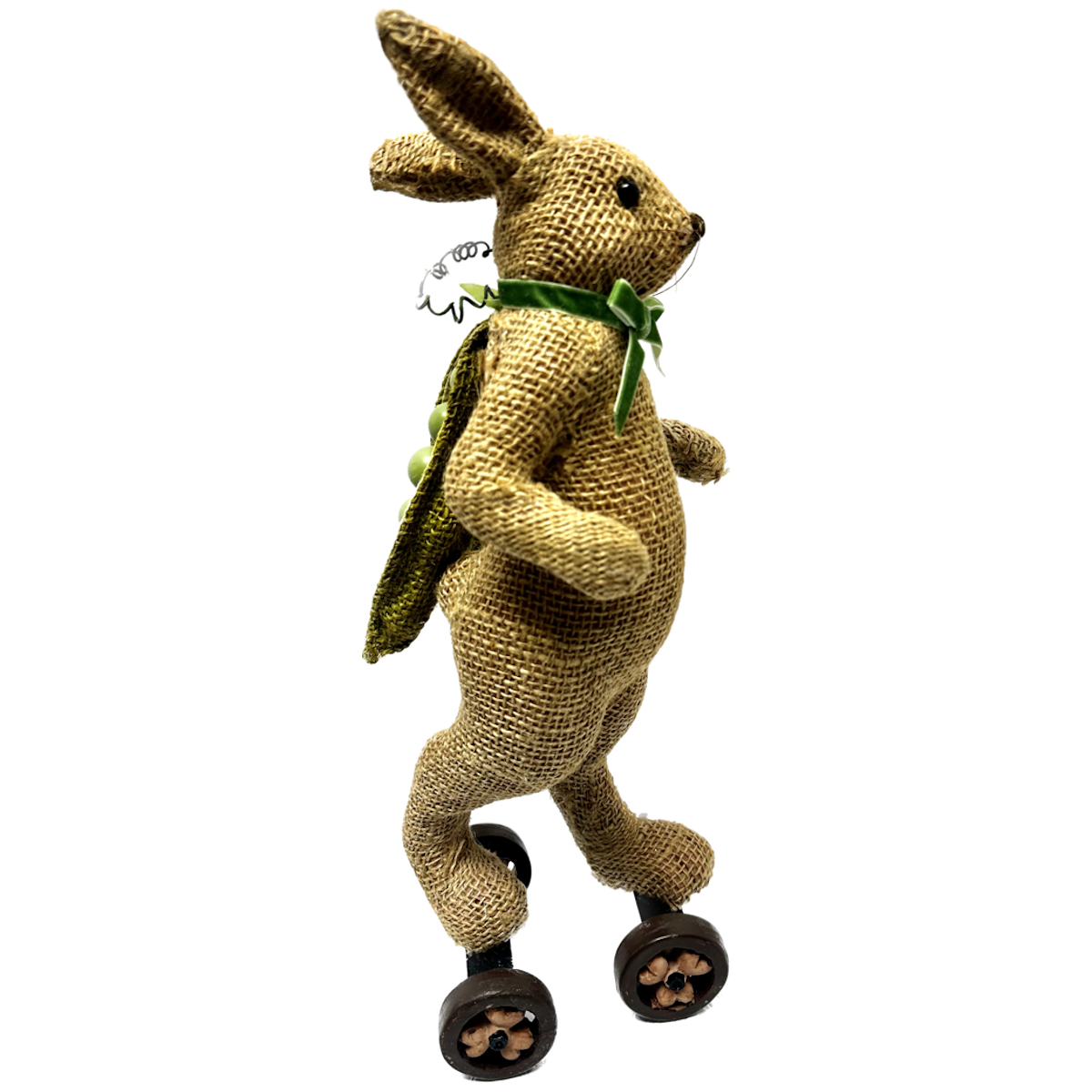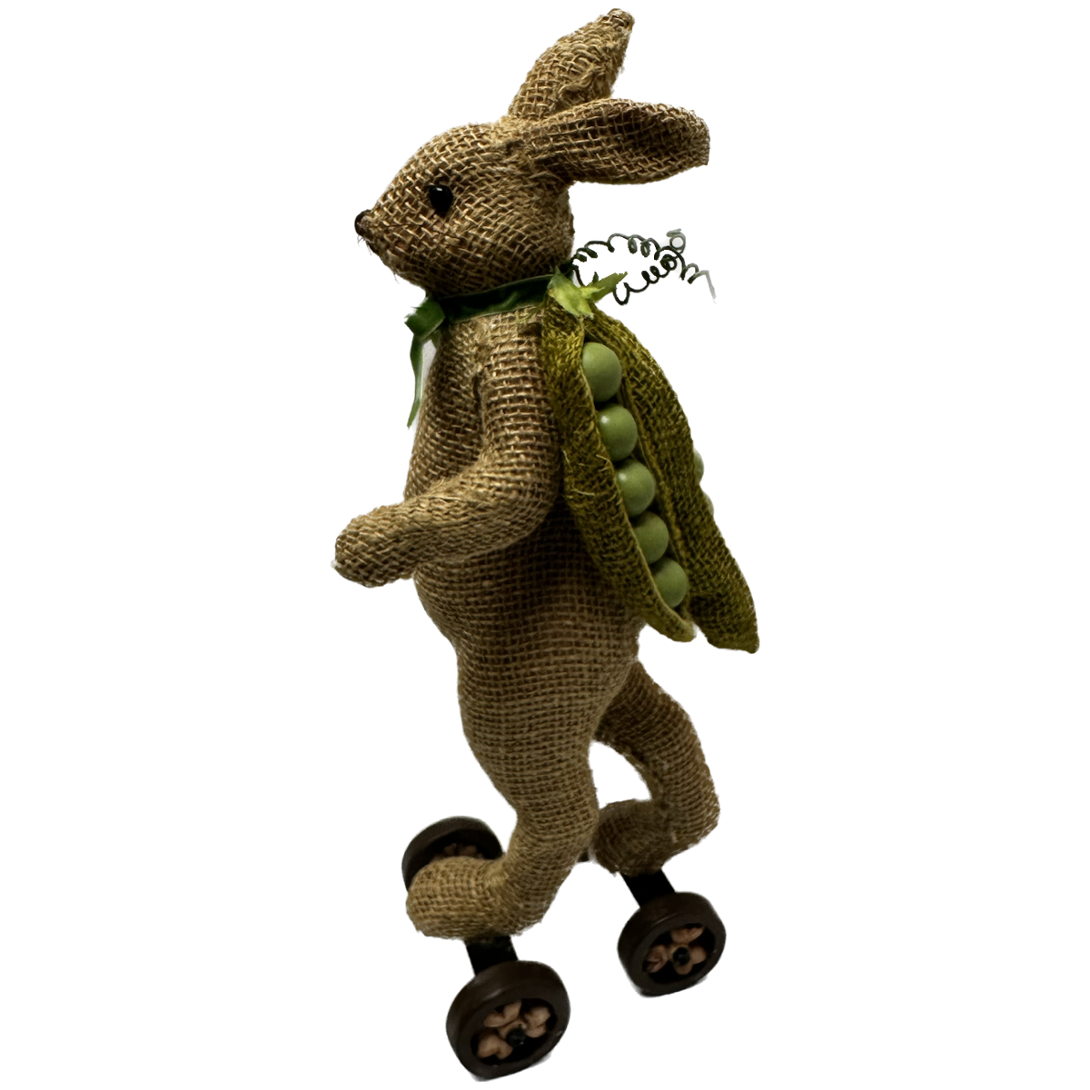 - Decorative burlap bunny on wood rollerskates with a pea pod backpack and a green velvet bow. Definately a unique decoration and one of the most unusual rabbits we've run across! And yes, the wheels do actually turn, but as cute as he is, this is not a toy!