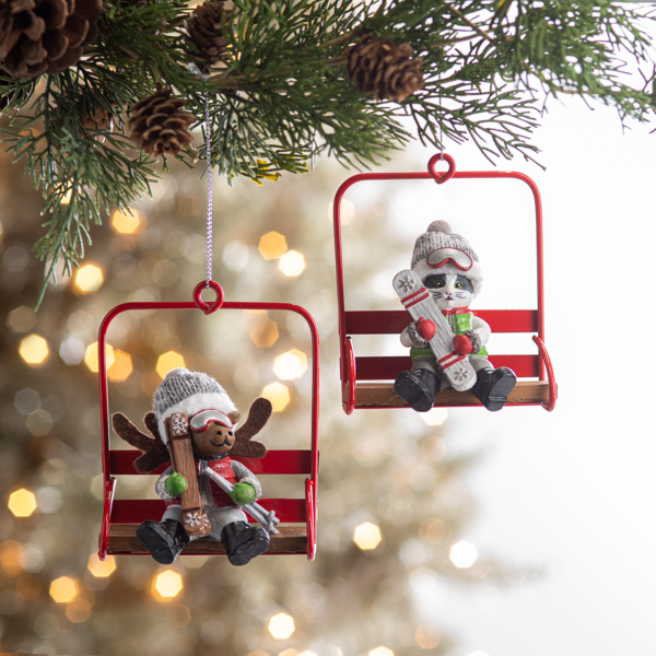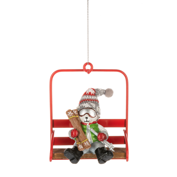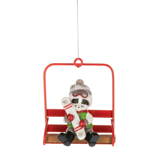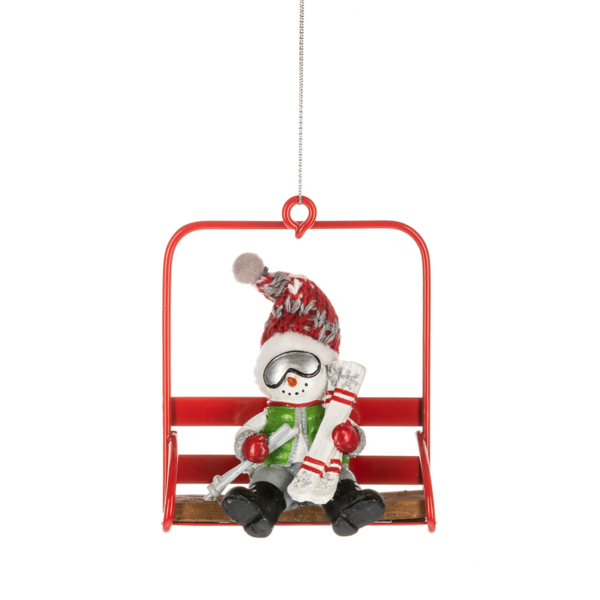 - Multicolored assortment of snowboarding characters on red metal ski chair lift. Each sold seperately