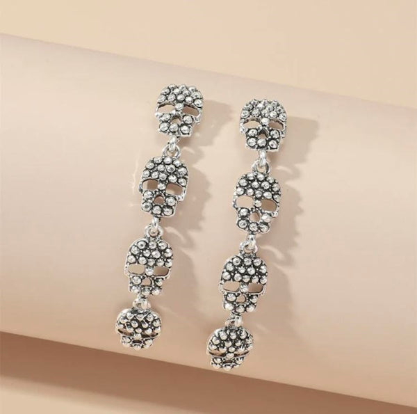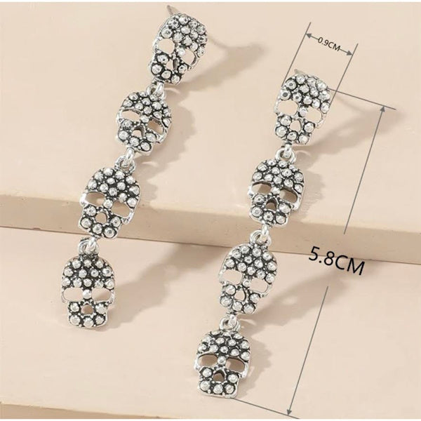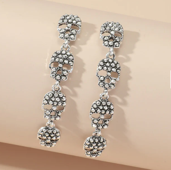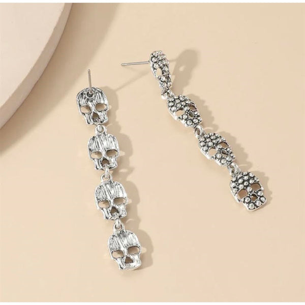 Add a touch of edgy fun to your look with these Skull Pendant Long Earrings. Crafted from four linked silver-colored skulls, they dangle playfully to catch the eye and spark conversation. Perfect for anyone who loves a bold accessory with a bit of mischievous charm.
