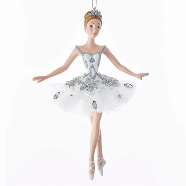 - Snow Queen from the Nutcracker Suite. This ornament features the snow queen ballerina in a white dress with silver gemstone detailing and silver glitter accents. She is shown with light brown hair and blue eyes.