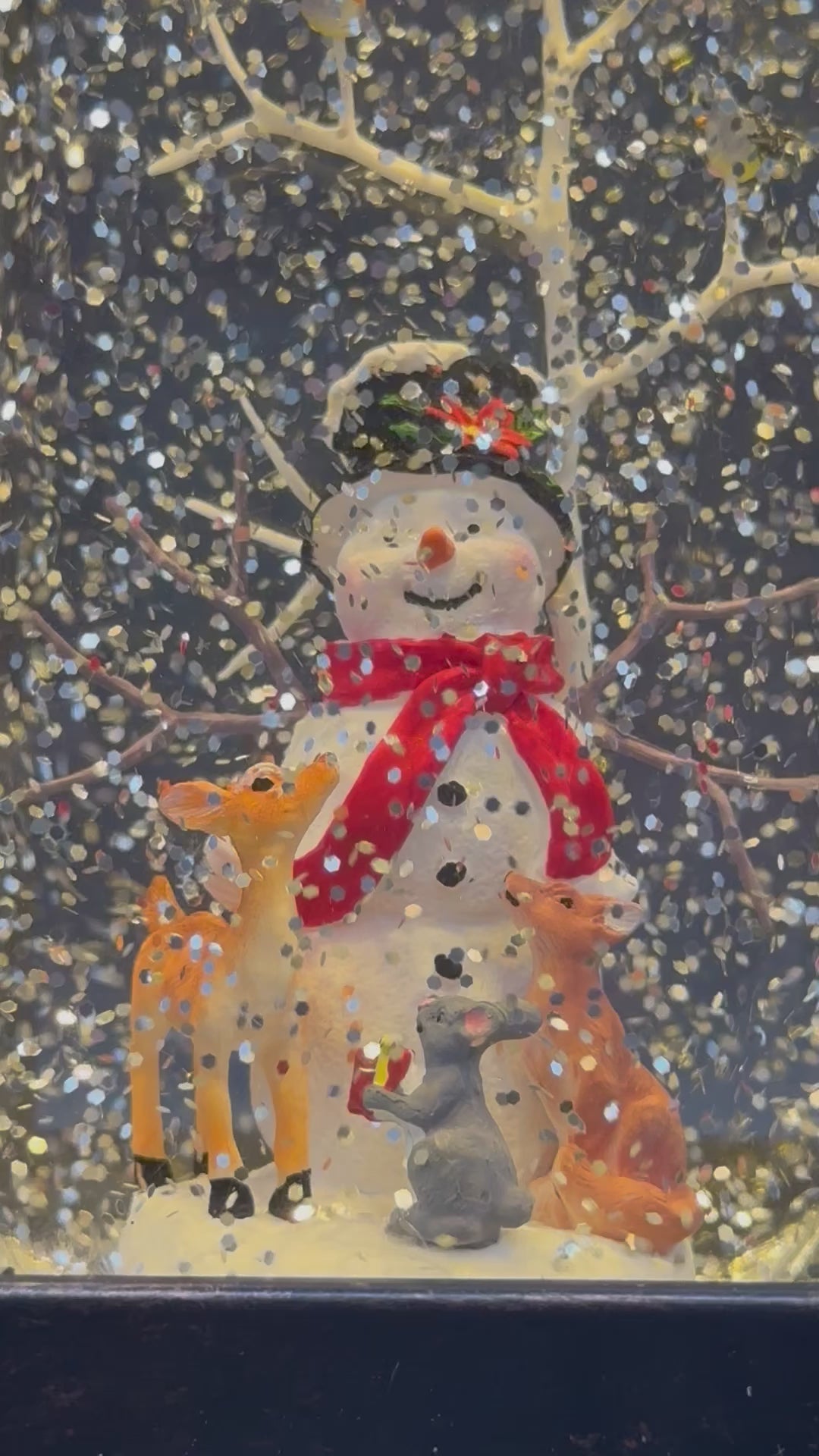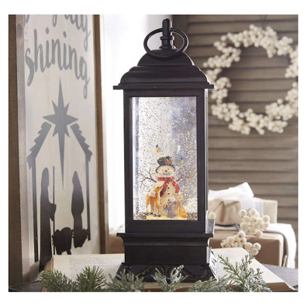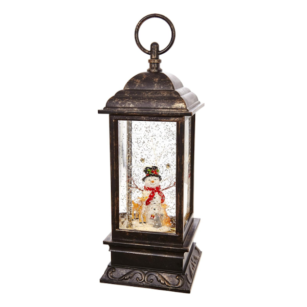 - RAZ Snowman Musical Lighted Water Lantern features an antiqued black/bronze casing, multicolored snowman in wintery woodland scene with swirling silver glitter