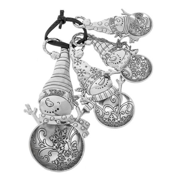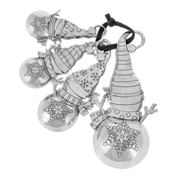 - Includes 1 ea. of 1 tbsp., 1 tsp., 1/2 tsp., 1/4 tsp. Different winter Snowmen-Themed designs on front and back side with lots of intricate details, all spoons knotted together with a faux leather tie