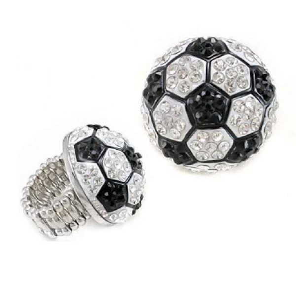 - Silver beaded soccer ball stretch stretch ring with clear rhinestones and black enamel accents